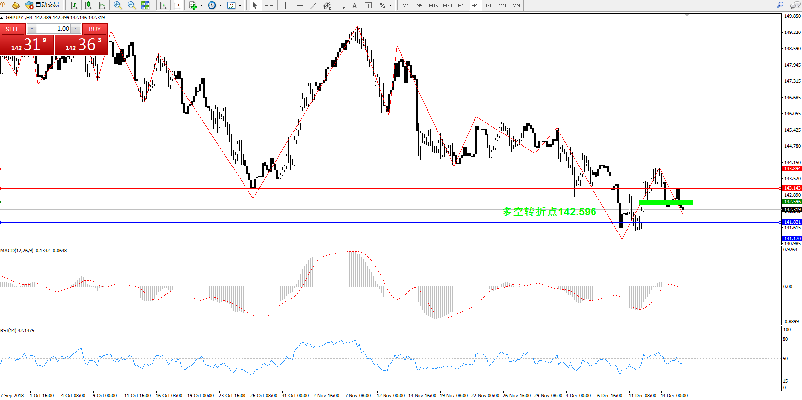 备选策略:142.596下方看跌,目标141.821、141.170