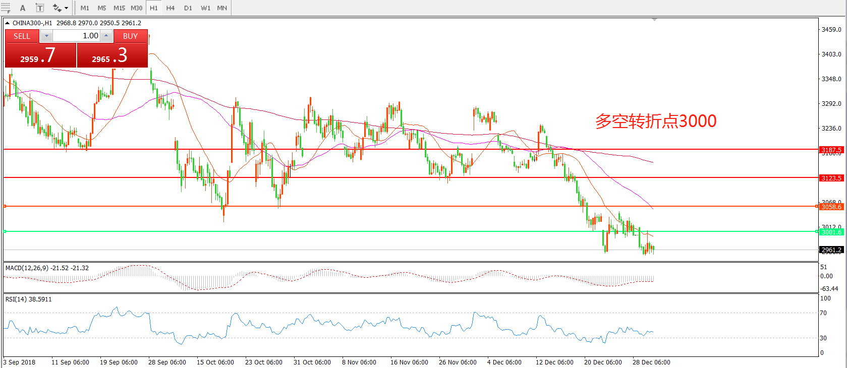 1小时图看,CHINA300中华指数跌破3000整数关口无力收复,均线系统呈空头排列, MACD绿柱增长,短线依然偏空