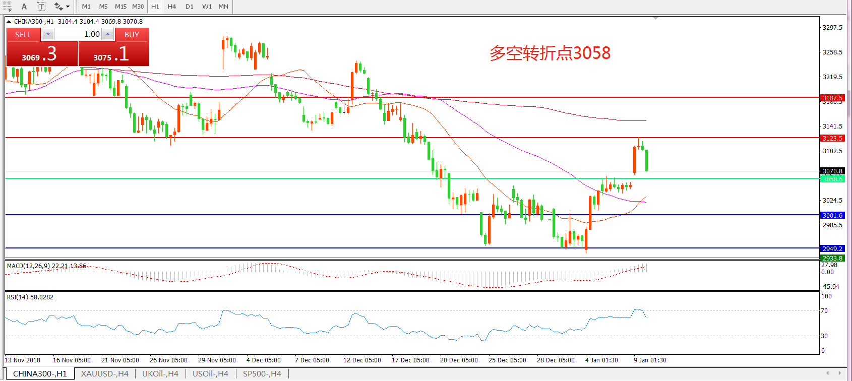 1小时图看,CHINA300中华指数收复3000整持续上行,冲击上方阻力失败后回吐大部分涨幅,均线系统走平, MACD绿柱增加,短线震荡整理概率较大。