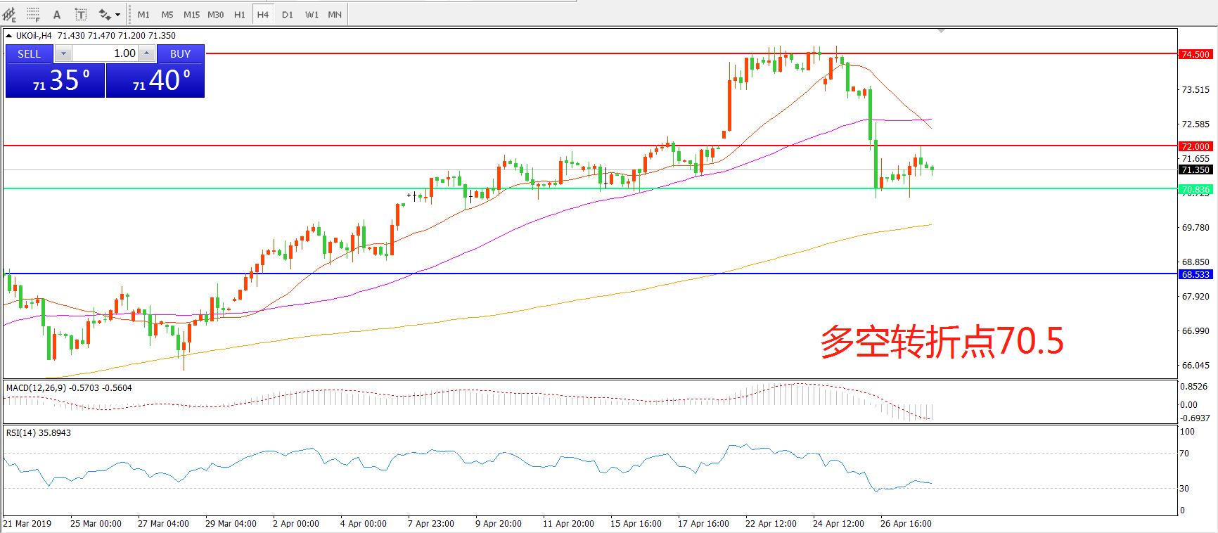 4小时图看,油价以200均线为支撑,暂时企稳,但短期均线下穿形成死叉,MACD绿柱缩短,RSI指标向下,日内窄幅震荡概率较大。