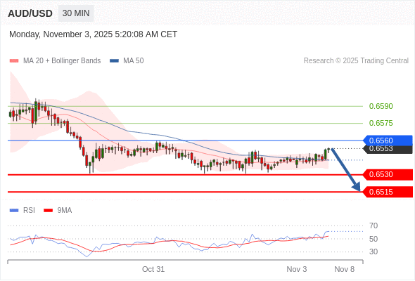 在 0.6560 之下,看跌,目标价位为 0.6530 ,然后为 0.6515 。