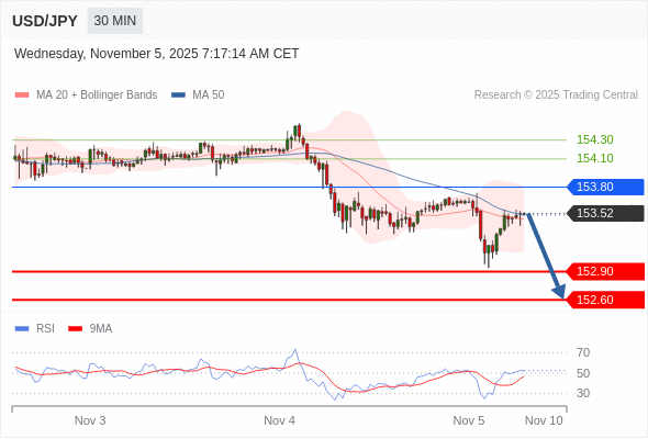 在 153.80 之下,看跌,目标价位为 152.90 ,然后为 152.60 。