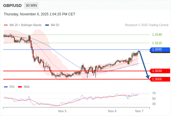 在 1.3095 之下,看跌,目标价位为 1.3030 ,然后为 1.3005 。