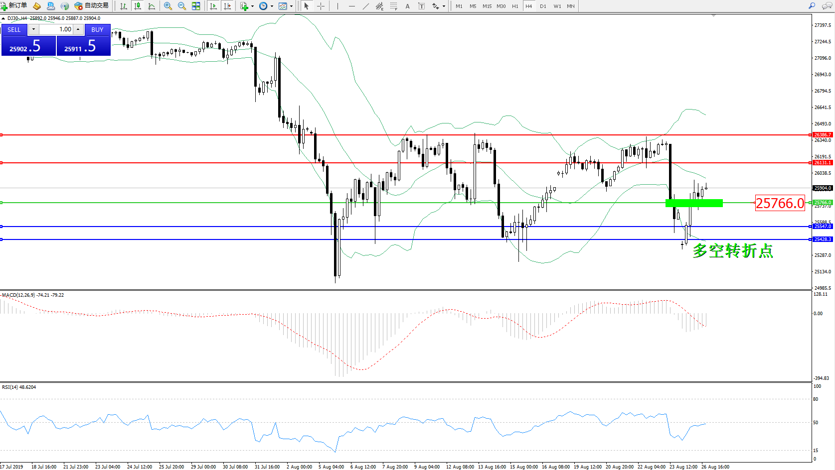 道琼斯指数8月26日(周一)收盘上涨269.90点,涨幅1.05%,报25898.83点。因特朗普关于贸易问题的乐观评论鼓舞了市场风险偏好。国际贸易关系有所进展的消息提振了市场情绪。市场仍在关注本周美国GDP等数据,以进一步研判美国经济衰退的可能性。,此外,美国7月耐用品订单数据和8月达拉斯联储制造业指数强于预期提振了美元,特朗普表示美国“非常接近”与欧盟达成可能的贸易协议。