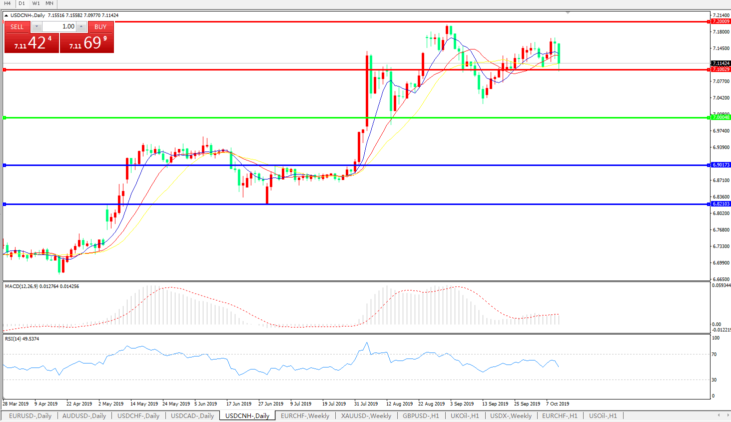技术面简析:日图均线整体呈攻势但短期均线拐头下行,汇价早盘骤跌回归7.10关口,MACD运行于0轴上方但量有缩量迹象,RSI快速走低,预计短期汇价随贸易谈判有所反复但中期汇价大概率将下行,上方重点关注7.20-7.30区间的压制;中美贸易谈判再度开启,进展须持续关注。