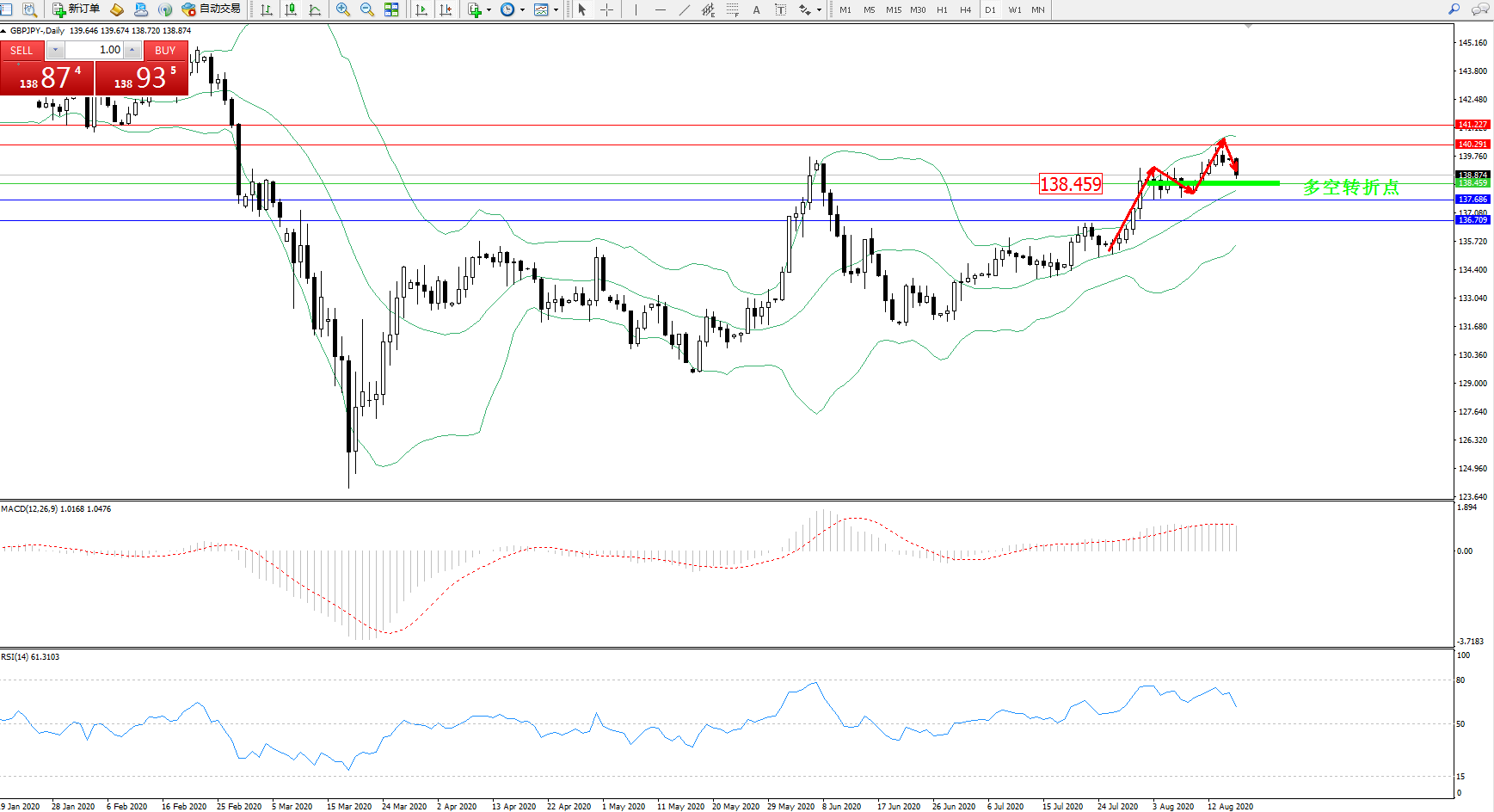 技术点评:多头动力延续布林带指标中上轨区间弱势震荡上扬中,多头动力处于循序渐进上扬走势,处于前期高位附近后开始震荡回撤,即将抵达布林带指标中轨附近节点,该位正是多空关键转折点,布林带指标通道呈上行走势持续,有持续拉升走势,前期高位破位后开始整理调整,MACD指标处于0轴线上方多头区域维持整理平移中,RSI指标处于多头区域维持整理走势后开始回调;