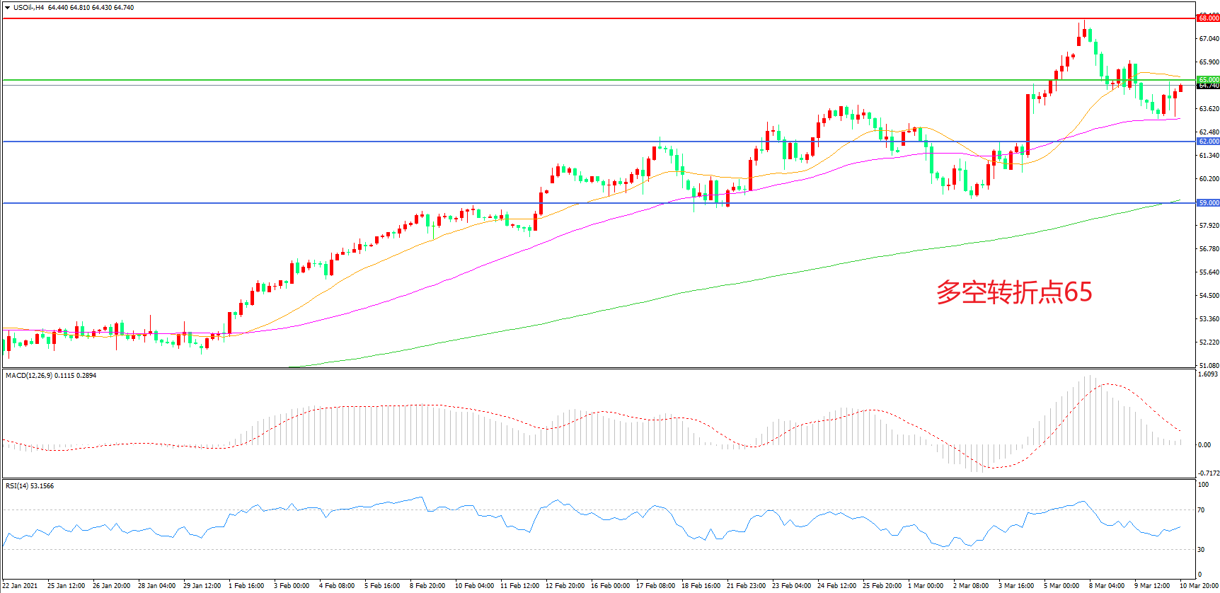 周三(3月10日),原油价格走势比较纠结,其中EIA数据的公布和俄罗斯宣布增加原油产量对市场影响巨大。根据美国能源信息署公布的数据显示,当周美国原油库存增加1379.80万桶,远超预期,但精炼油库存和汽油库存大降,支撑了油价的强势表现,美国WTI原油延续高位震荡,收报64.67美元/桶。