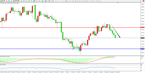 市场空头情绪笼罩,低位多头持续震荡上移后开始反转向下移动,短期空头动力有继续向下移动态势,上方压制关注1787附近,低位支撑关注1703附近,MACD指标处于0轴线上侧弱势下移,RSI指标处于50均衡线下侧弱势整理;如图:
