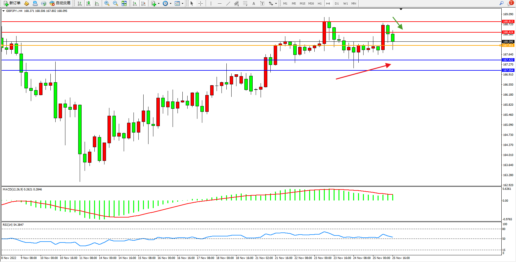 4小时图看:高位短期震荡上扬后遇阻回撤,短期尚未突破前高位置,MACD指标处于0轴线上側徘徊,RSI指标处于50均衡线上側弱势整理;
