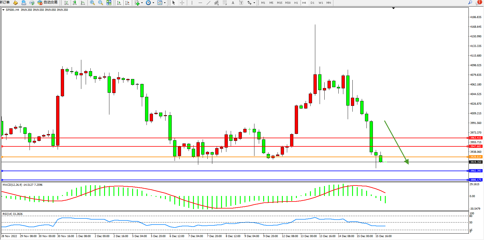 标普500指数12月15日(周四)收盘下跌96.82点,跌幅2.42%,报3898.50点;美国11月零售销售数据表现不及预期和前值,实际公布录得-0.6%,而前值为1.3%。在通货膨胀的大背景之下,人们付的钱更多,买到的东西却少了。许多美国民众消费欲望并不高。