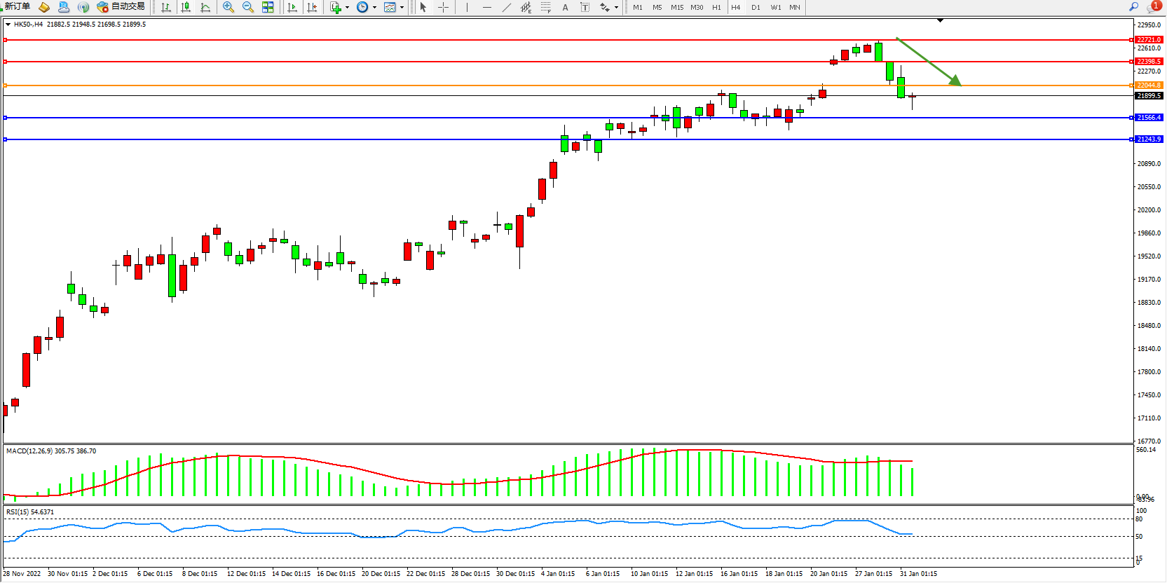 香港恒生指数1月31日(周二)收盘下跌227.4点,跌幅1.03%,报21842.33点;港股尾盘拉升,三大指数跌幅快速收窄仍全线收跌,录得2日回调。恒生科技指数一度跌至2.4%,最终下跌0.82%,恒指、国指分别跌1.03和0.95%。1月收官,三大指数均涨10%。,大型科技股多数下跌,百度跌超3%,京东、腾讯、阿里巴巴等权重均走低。