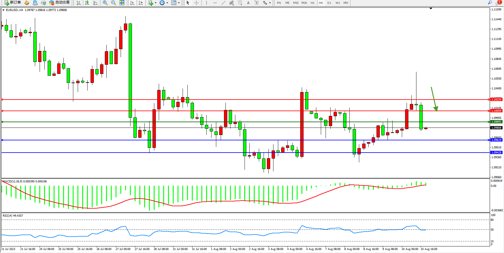 欧元美元EURUSD—4小时K线图显示: