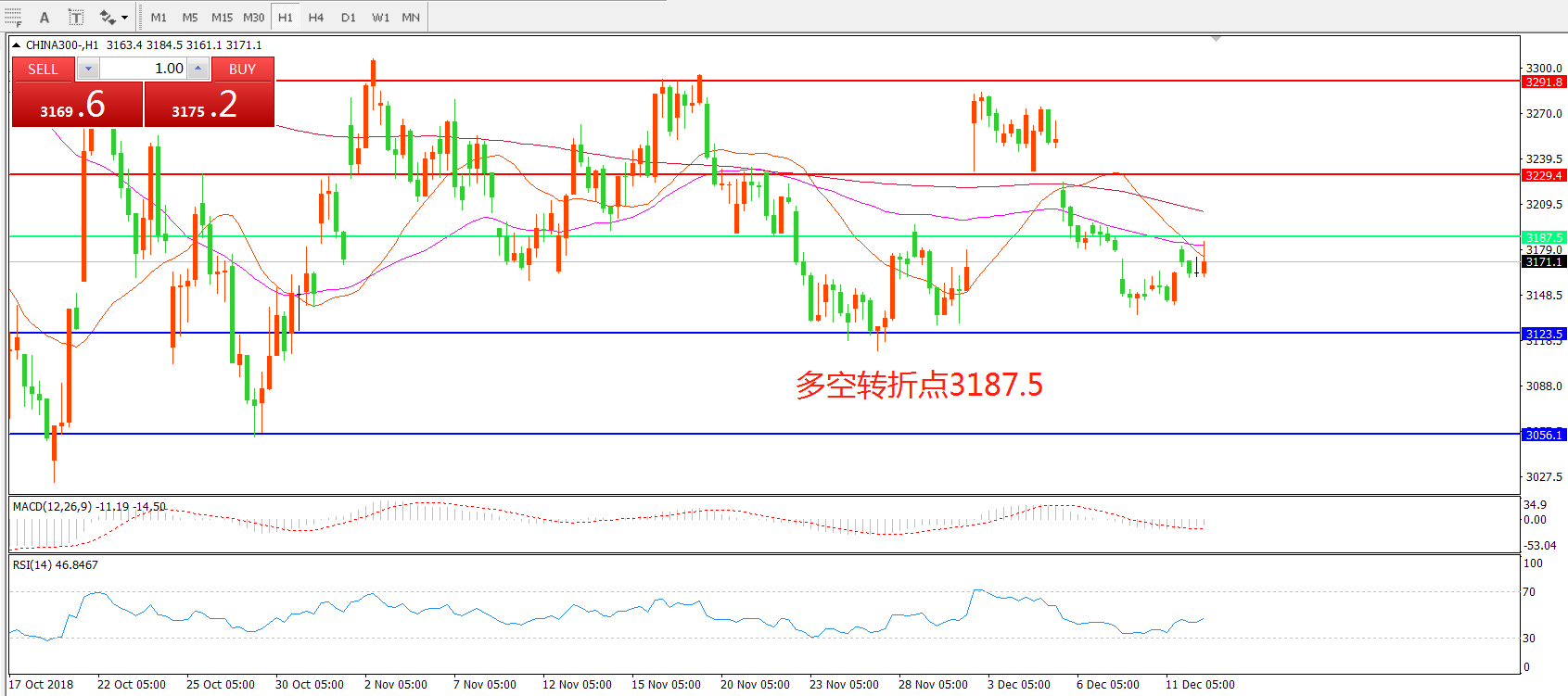 1小时图看,CHINA300中华指数延续震荡走势,整体价位处于均线之下进行盘整, MACD绿柱缩短,RSI直指标有拐头迹象,日内走势以整理走势为主。